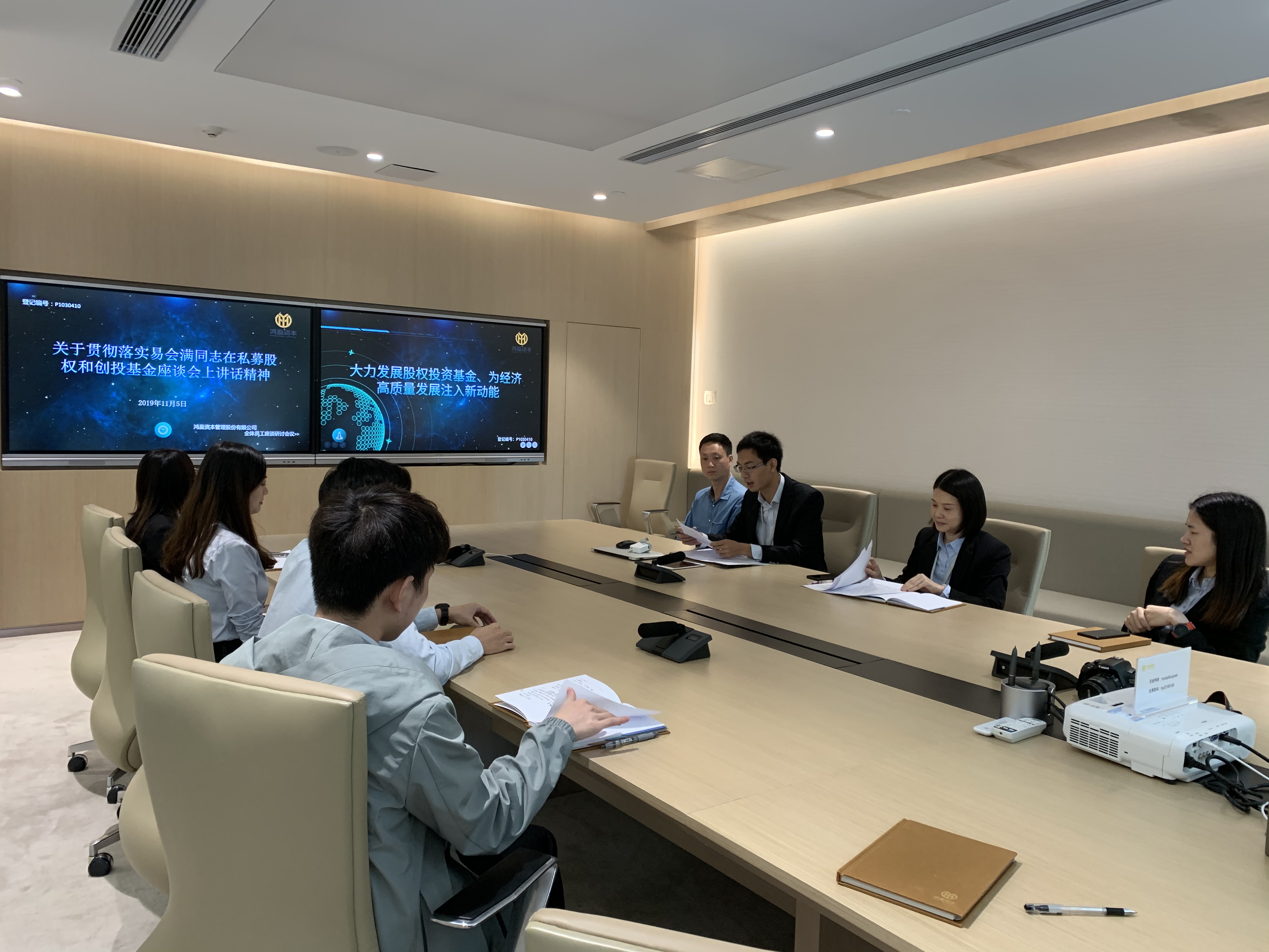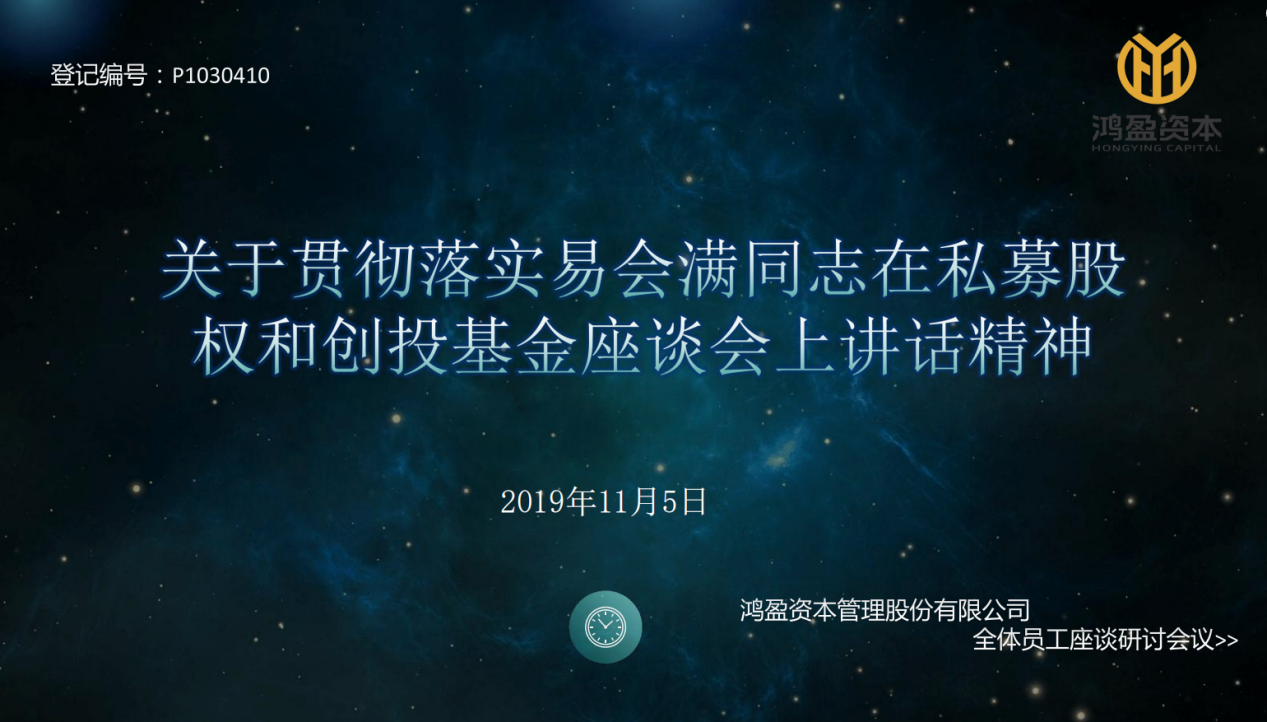 我司接到证监会《关于贯彻落实易会满同志在私募股权和创投基金座谈会上讲话精神的通知》,公司领导高度重视,聂鸿杰总裁就此作出批示,要求迅速向下传达,抓好贯彻落实。并由人事行政部组织,于2019年11月5日上午召集公司全体员工学习贯彻此次座谈会讲话精神。